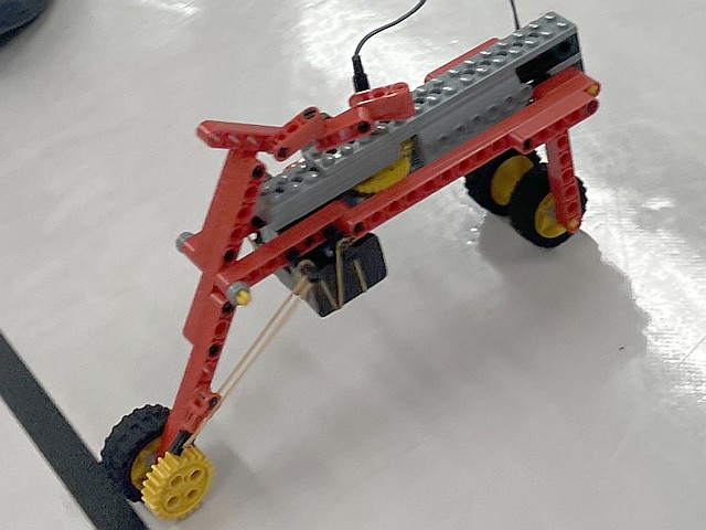 どうあがいても(前後のロッドで漕ぐタイミングがどんなでも)、前後輪ともラチェットを付けて後退を阻止(そし)するのだから、1日目(前輪ラチェットだけ)のロボットよりは前に進みやすくなると思うでしょう?