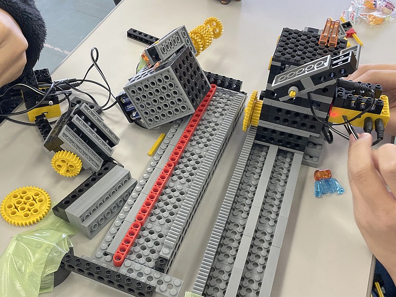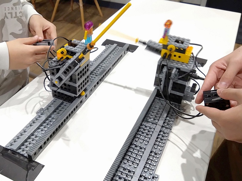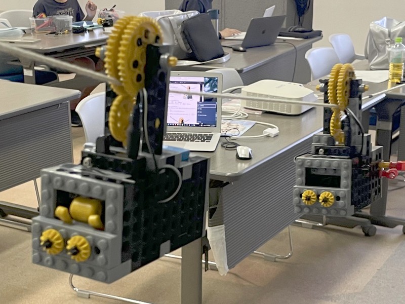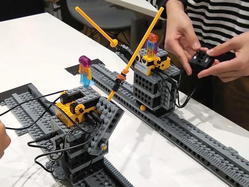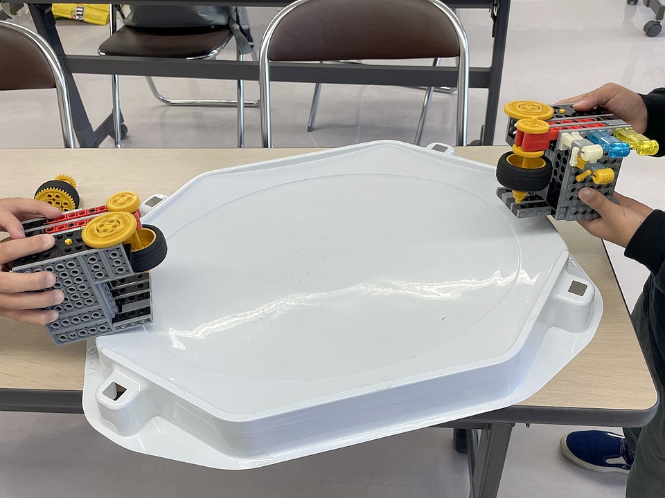 タッチスイッチ2個で手動操縦するプログラムにしたり(*2)、移動も攻撃も自律化するプログラムにして試合中の操作を禁じたり、派手なロボットも、地味なロボットも、様々に勝負を盛り上げていました。