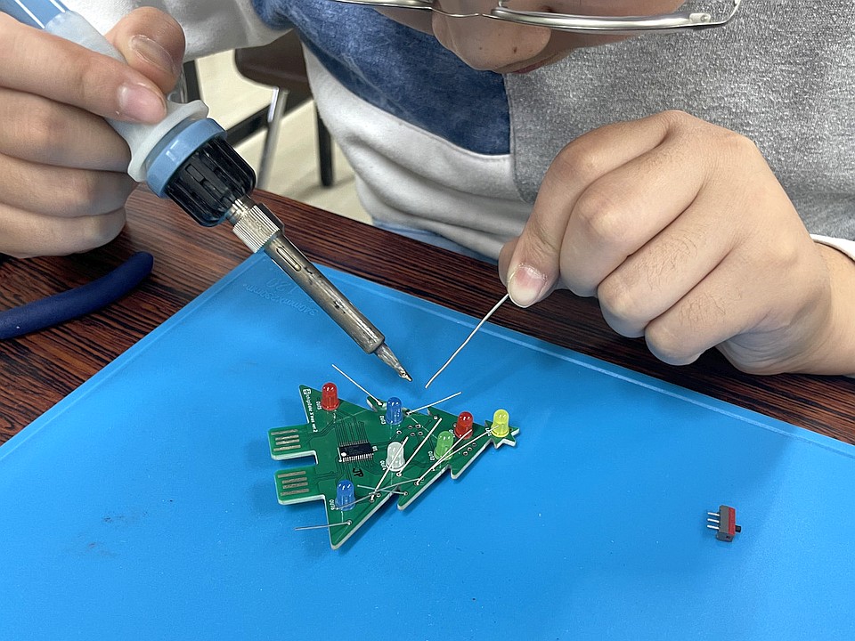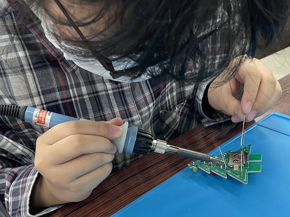 前半は、5色から好きな色のLED7本をツリー形の電子基板にはんだ付けしました。