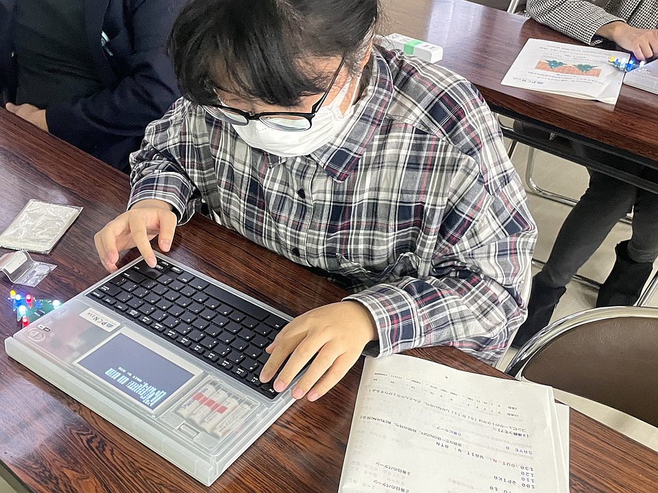 後半は、7つのLEDが光るパターンを好きなようにプログラミングしました。