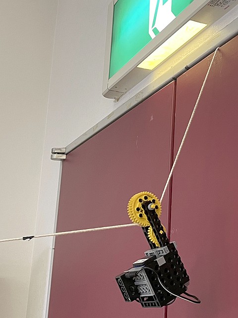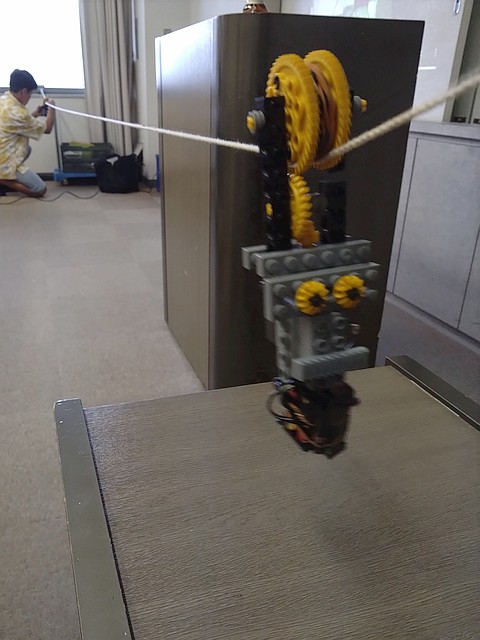 ピンと張った紐(ひも)を伝(つた)うロボットですが、1日目はロープウェイ、2日目は一輪車でサーカスの綱渡りをするようなロボットと、形態を大きく変えます。